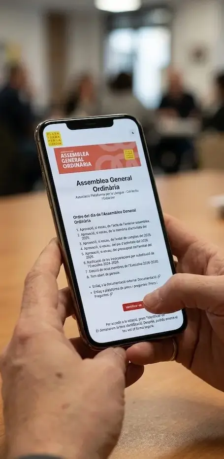 The organization has 26,384 members, primarily distributed across six Catalan-speaking territories in four states: Spain, France, Italy, and Andorra, along with additional members living elsewhere around the world. This geographic dispersion is precisely why, since 2022, the organization has run its annual assemblies and board elections in hybrid format, combining in-person attendance in Barcelona with digital participation from anywhere in the world, on equal terms, using Vocdoni's online tecnhology.