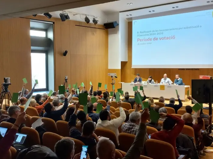 On March 21st, 2026, Plataforma per la Llengua held its Annual General Meeting and executive board elections at the Ateneu Barcelonès in Barcelona. Some members were in the room. Others voted from Perpinyà, l'Alguer, València or other parts of the World. Every one of them had an equal vote.